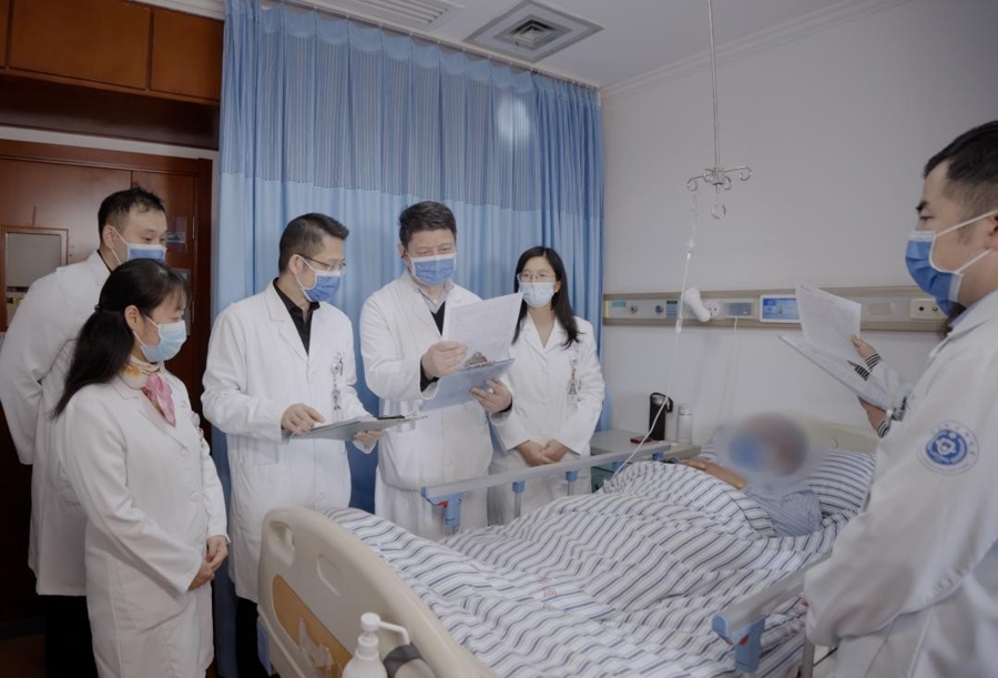 图为胡海研究员(左四)在病房里查房