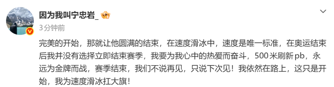 据新黄河,3月7日,宁忠岩发文表示:完美的开始,那就让他圆满的结束,在速度滑冰中,速度是唯一标准,在奥运结束后我并没有选择立即结束赛季,我要为我心中的热爱而奋斗,500米刷新pb,永远为金牌而战,赛季结束,我们不说再见,只说下次见!我依然在路上,这只是开始,我为速度滑冰扛大旗!